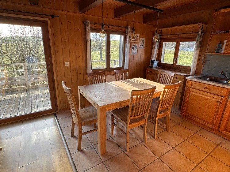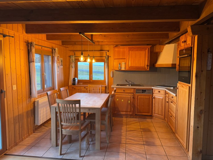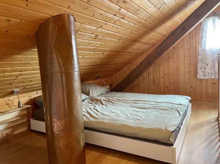 1er étage : Espace ouvert avec cuisine équipée et pièce à vivre. Balcon de 25m2 orienté plein Sud. Salle de bain avec WC et douche. Poêle à bois.