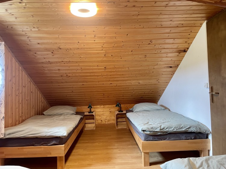 2ème étage : Espace mansardé pour la nuit avec une chambre équipée avec à choix, un lit double et 2 lits simples ou 4 lits simples. Un autre lit double est disponible à l’arrivée des escaliers.